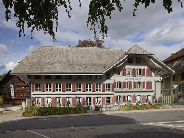 Seit dem Mittelalter bereichert der Bären als Gasthaus das Dorf. Die heimelige und dennoch moderne Atmosphäre des Hauses wird Sie begeistern. Die Küche ist frisch, kreativ und hausgemacht. Wenn immer möglich verwendet der Gasthof Naturprodukte aus der Region, die von den lokalen Partnern bezogen werden. Der Gasthof ist zentral gelegen mit zahlreichen Parkplätzen für Velo und Auto direkt neben dem Haus.